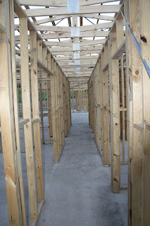 The frame is coming along nicely, the shower niches have been cut out, the windows are being set up more and the few missing walls are now in place. Pretty exciting to see the framing around our high light windows in the living room.